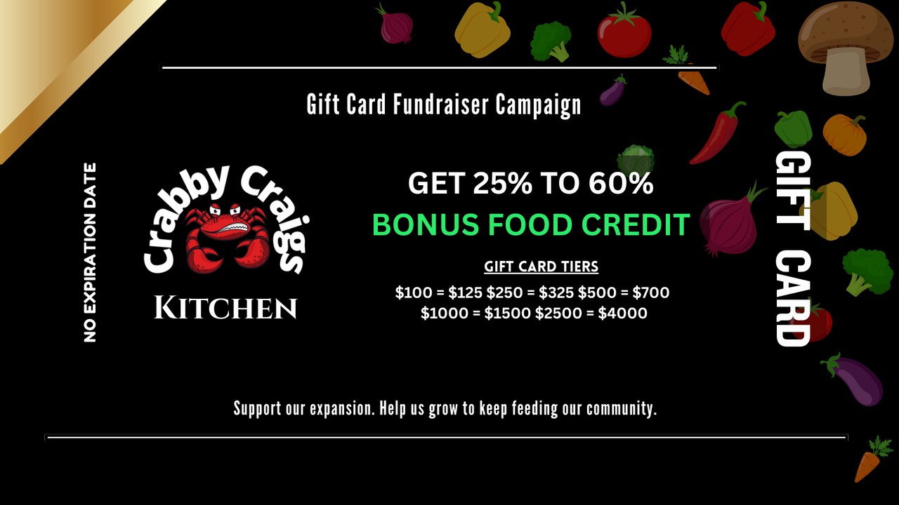 With my back against the wall, I turned to the one thing ive always been able to fall back on: my ability to cook. With only a $300 budget, Crabby Craigs Kitchen was born. Today almost 4 years later my credit is back in good standing yet the banks still decline me for traditional loans and I refuse to take predatory, high-interest offers that will bleed my business dry. I would much rather give that value back to you.
